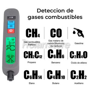 . Detecta: Acetona, acetileno, alcohol, amoníaco, benceno, etanol, óxido de etileno, gasolina, hexano, hidrogeno, metano, alcoholes minerales, gas natural, Diluyente de pintura, propano, solventes, etc.