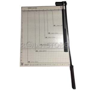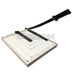 Guillotina metálica con base adherente para cortes rápidos y precisos, con capacidad de corte de hasta 12 hojas por corte.