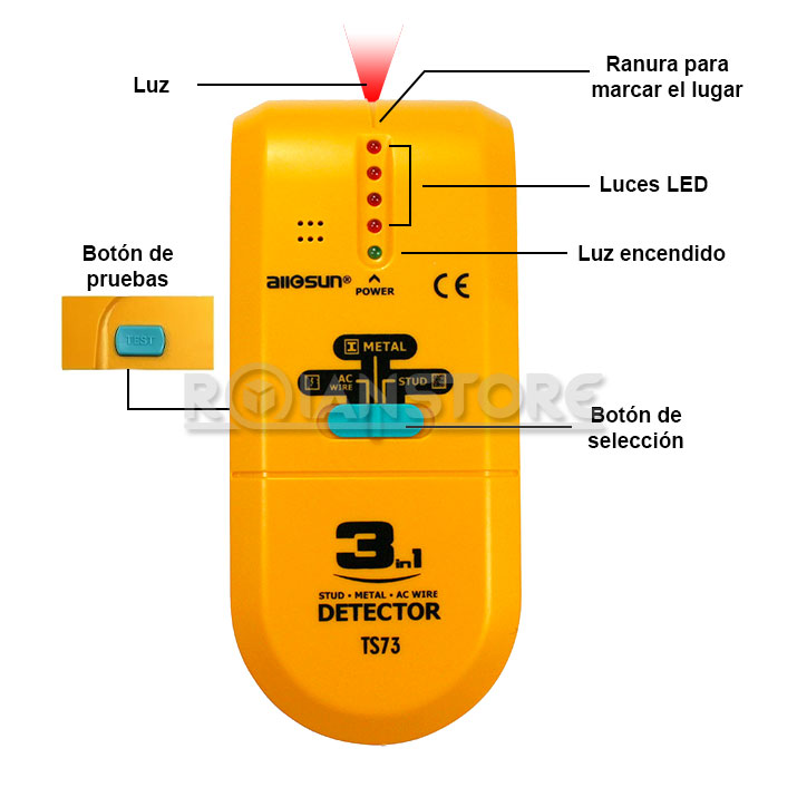 Esta unidad es un detector avanzado. Se puede utilizar para detectar y localizar pernos, metal y voltaje de CA. Se puede utilizar en construcción, montaje, carpintería, etc.