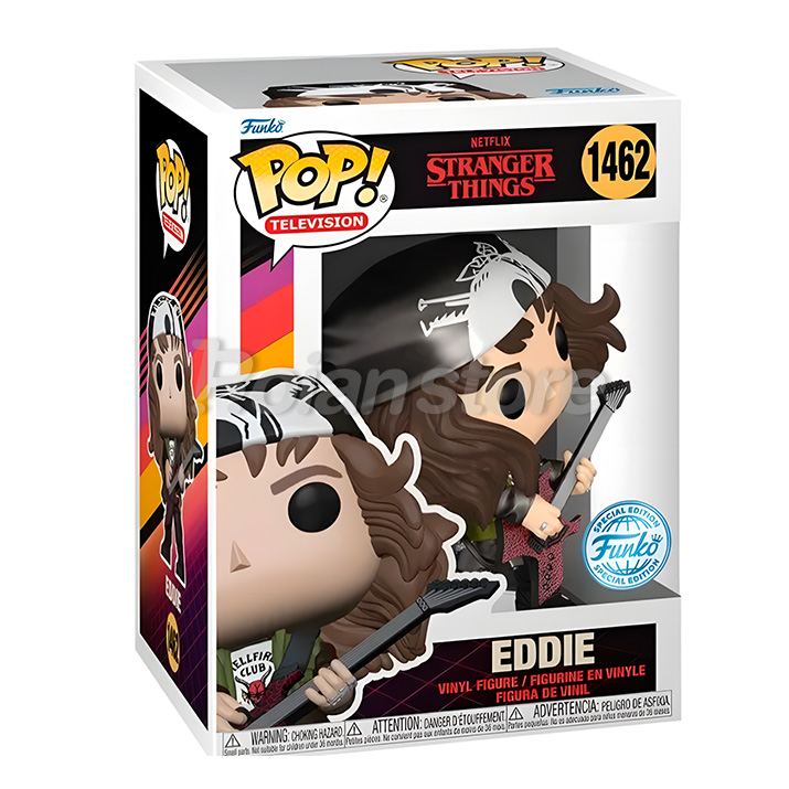 Revive uno de los momentos más épicos de Stranger Things con el Funko Pop! de Eddie Munson. Esta figura coleccionable, con un exclusivo acabado metálico, captura a Eddie en su pose más icónica con la guitarra.