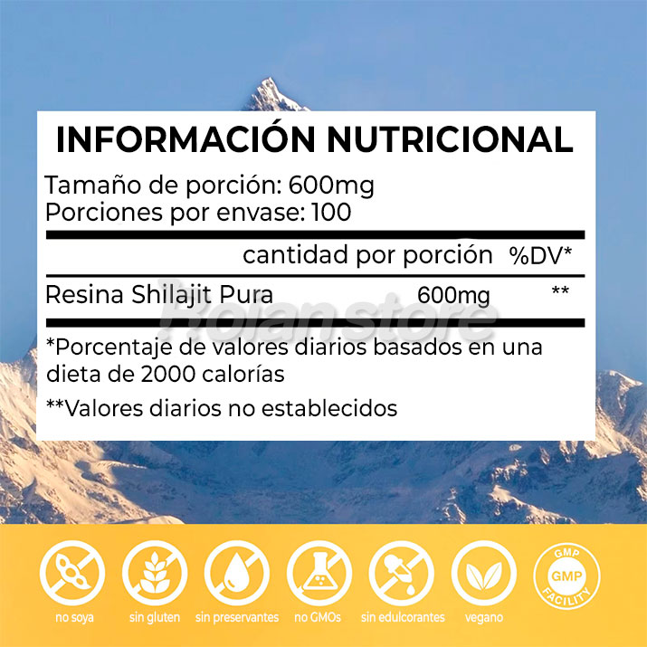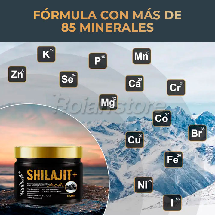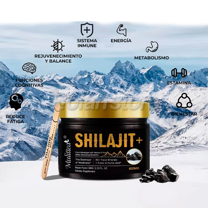 Suplemento natural que proviene de las montañas, compuesto por más de 85 minerales traza y antioxidantes. Sirve para aumentar los niveles de energía, mejorar la memoria, fortalecer los huesos y combatir el envejecimiento celular.