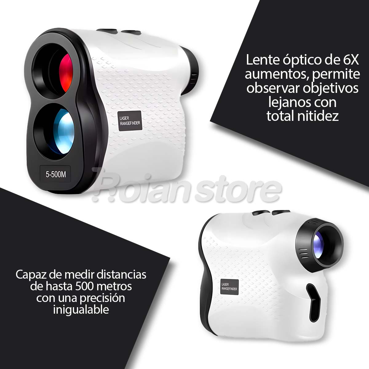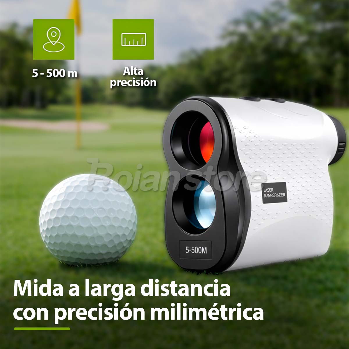 . Capaz de medir distancias de hasta 500 metros (o yardas) con una precisión inigualable, optimizando la toma de decisiones en el campo de golf o en actividades de caza y topografía ligera.